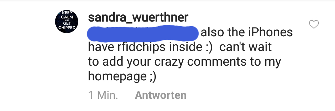 und weiter gehts mit dem nächsten Aluhutträgern, bei dieser Person war ich mehr als nur geschockt. Hab kein Problem wenn man RFID Chips etc ablehnt, aber bei meiner Frage nach medizinischen Implantaten, sagte sie das sie lieber sterben würde,… Sie hat mittlerweile ihr Profil schon lange auf privat und auch ihren Namen verändert – aber man konnte vorher sehen, das sie 2 Kinder hat! Mir tun die Kinder von solchen Leuten extrem leid.