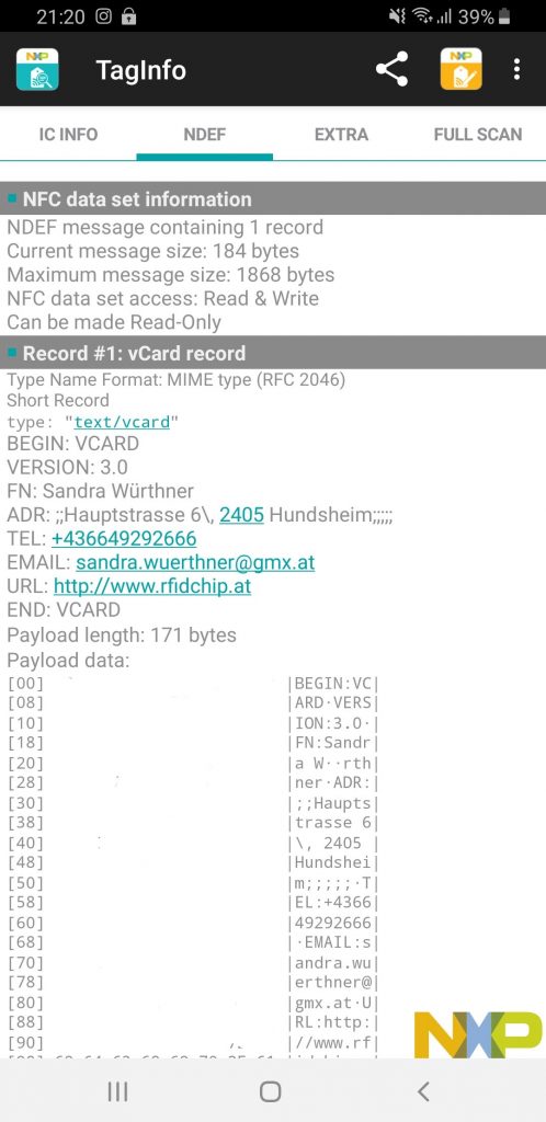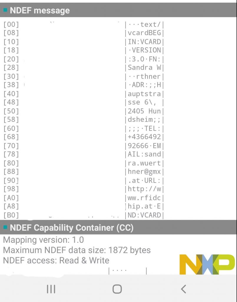 Unter NDEF sieht man die einzelnen DAtensätze, bei mir ist es die Visitenkarte – sorry ich habe die Zahlen etc alle gelöscht.